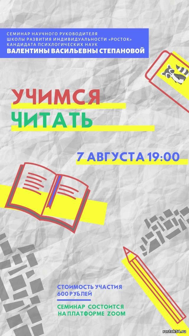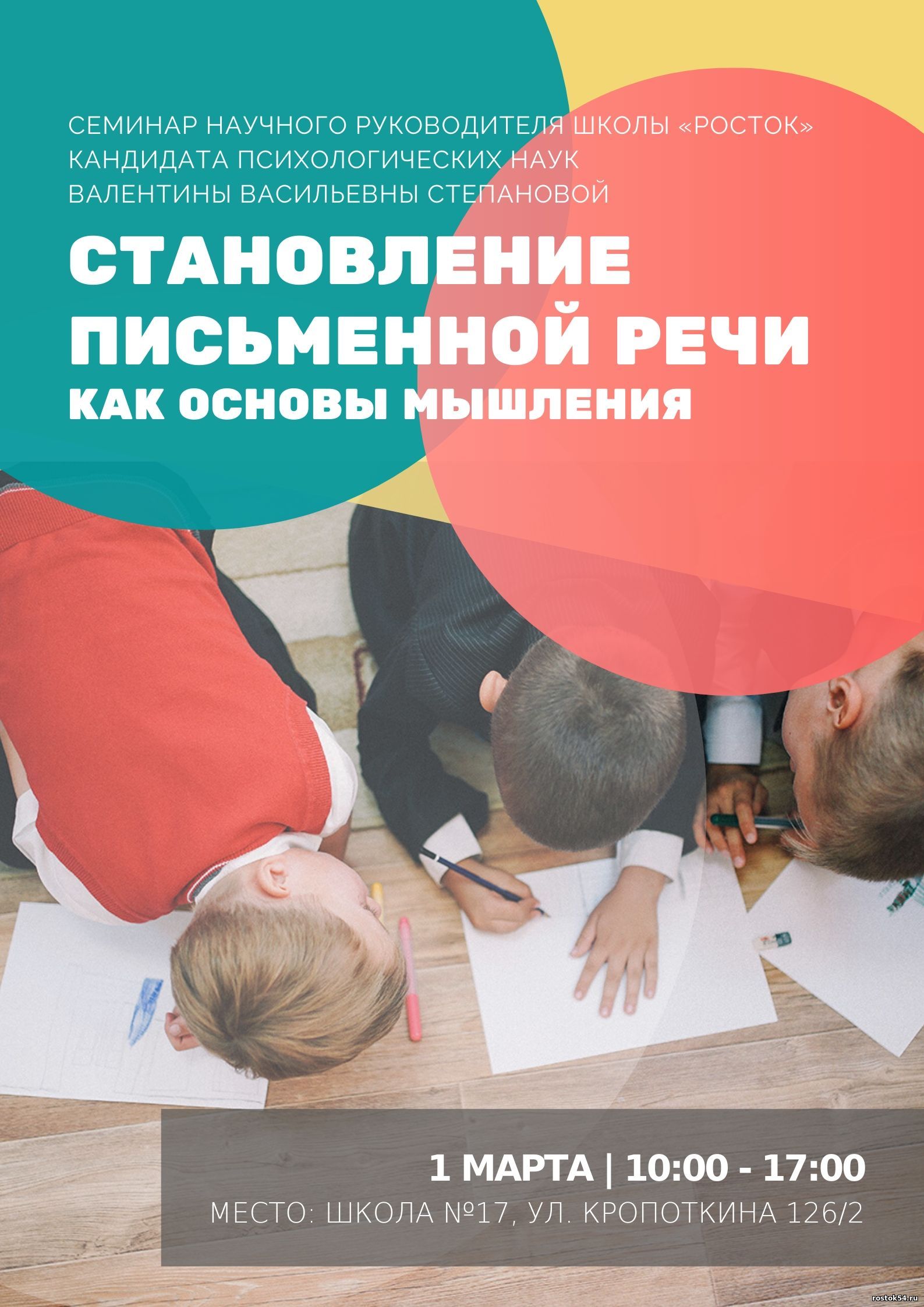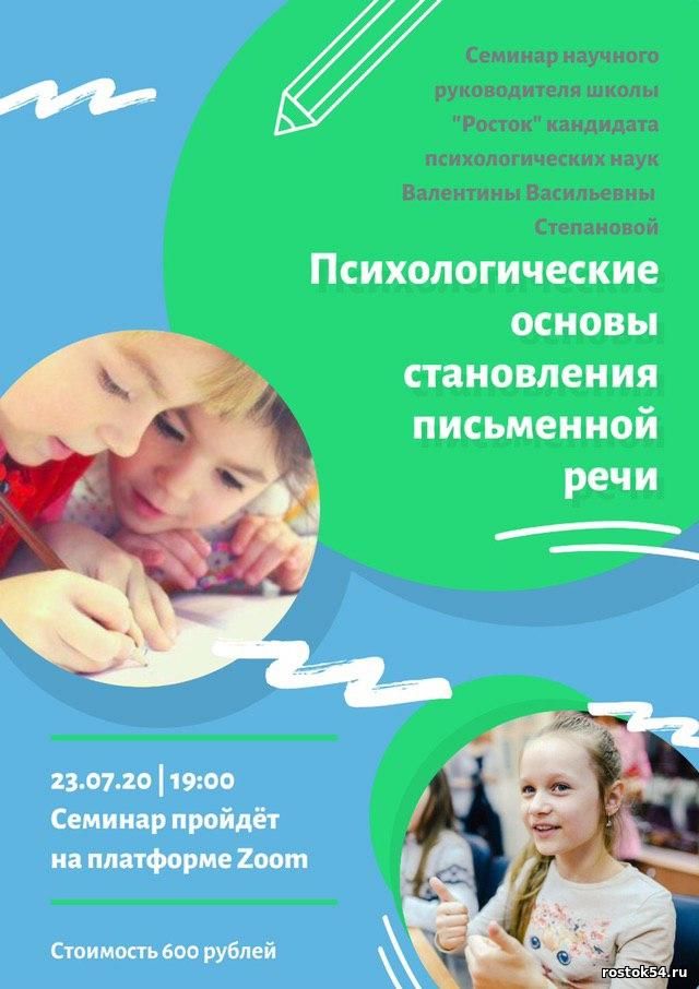 Уважаемые родители! В четверг, 23 июля, в 19:00 по времени Новосибирска на платформе Zoom состоится семинар Валентины Васильевны Степановой по теме "Психологические основы становления письменной речи." Анонс семинара в прямом эфире с Валентиной Васильевной проходил в Инстаграм - "Рождение письменной речи." Запись еще доступна instagram.com/rostok_school Стоимость участия в семинаре: 600 рублей. Запись семинара для участников будет доступна бесплатно в течение двух месяцев. |